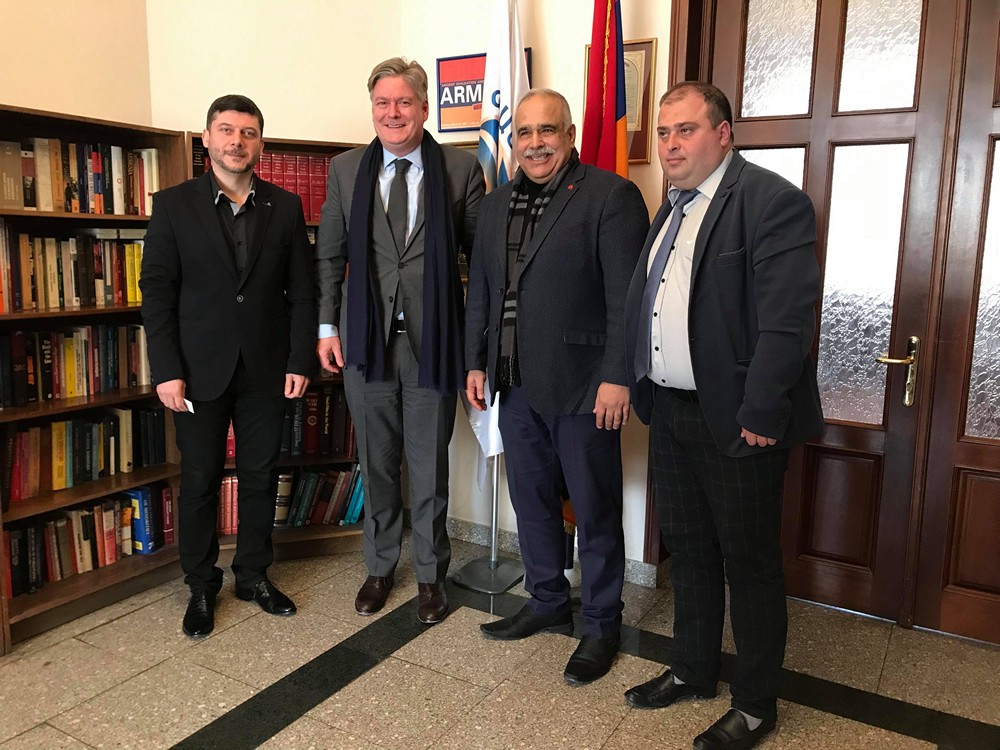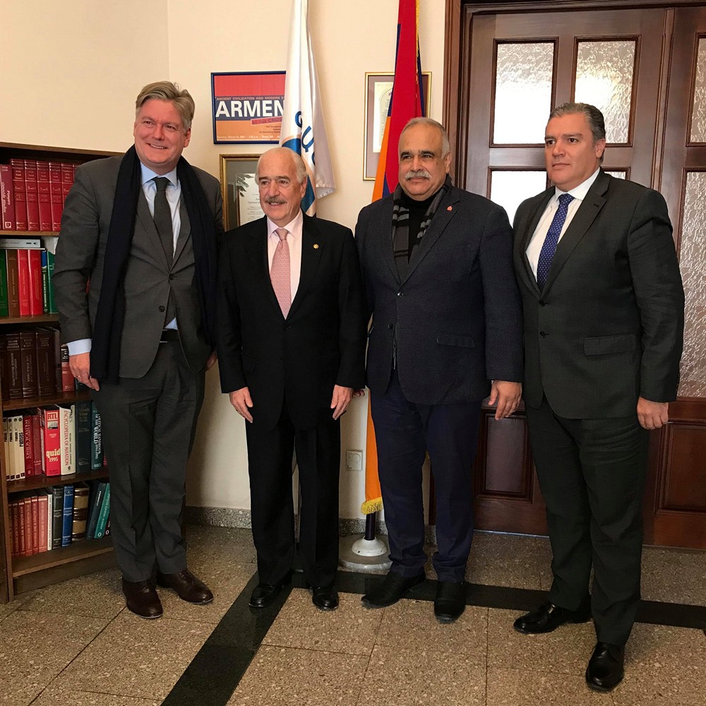 Yerevan—At Heritage Party headquarters here today, Heritage founder and political council chairman Raffi K. Hovannisian, international secretary Andranik Grigoryan, and party member Hovsep Khurshudyan received former president of Colombia and current president of the Centrist Democrat International (CDI) Andrés Pastrana, Secretary General Antonio López-Istúriz White of the European People's Party, and senior representative César Rosello.