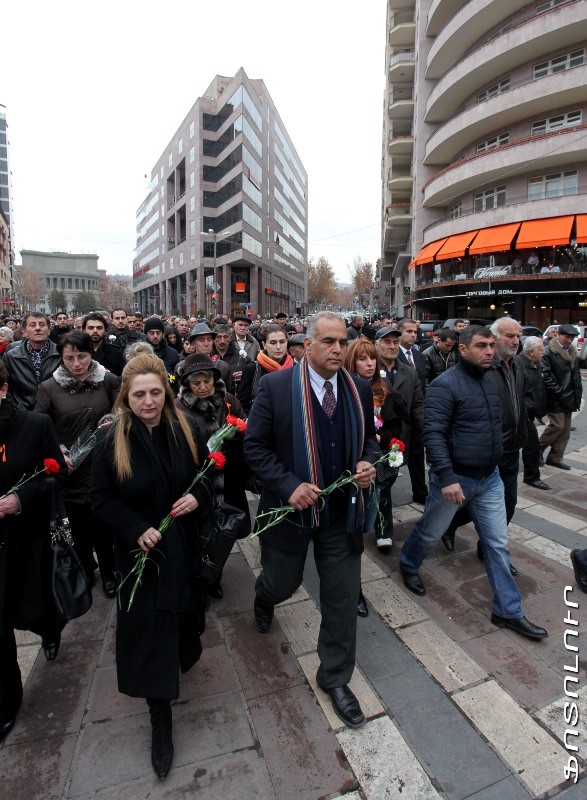 Այնուհետ նա զոհերի հիշատակին նվիրված երթն առաջնորդեց դեպի Մյասնիկյանի արձան, ուր ծնկի իջավ՝ ծաղիկներ դնելու եւ հարգելու զոհերի խաղաղ հիշատակը: Հիշատակման այս օրը Րաֆֆի Հովհաննիսյանն ավարտեց Սբ. Սարգիս եկեղեցում, որտեղ մասնակցեց հոգեհանգստյան արարողությանը: